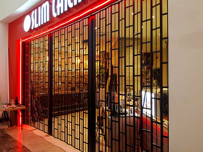 Photos of the Vision Guard sliding security shutters installed at Slim Chickens