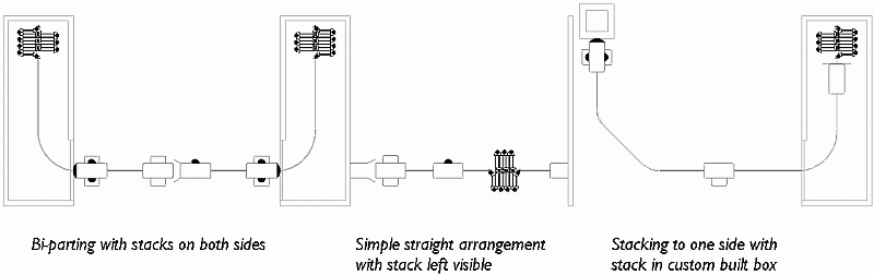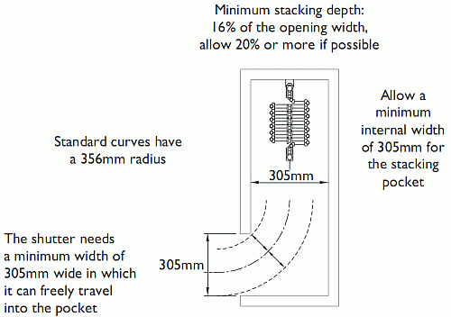 A partition for the shutter to stack into needs to be a certain width. If you want to curve the stack (for example in a 90 degree angle), you must allow a minimum internal partition width of 305mm. If you plan to stack the curtain in the same line as the shutter, the minimum internal partition width needs to be 228mm.
